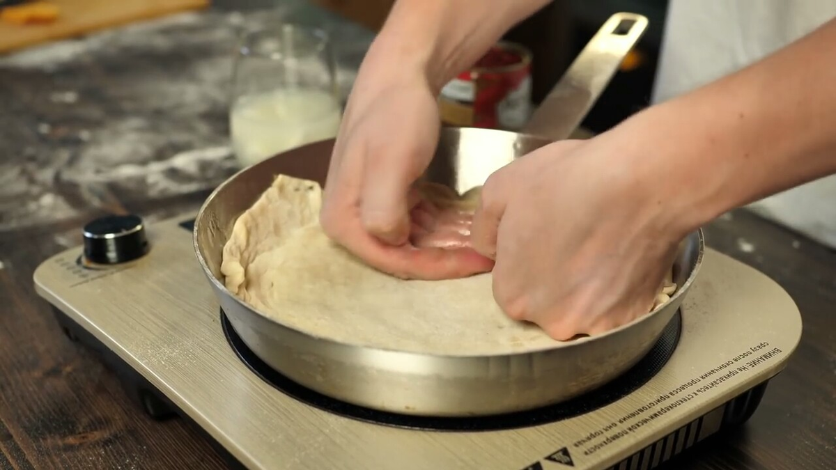 1) Горсть муки раструсили по столу, положили сверху покупное, обычное, сдобное тесто. Скалкой, если нет-бутылкой, раскатали тесто как-нибудь. Прикинули под размер сковородки. Лишнее отрезали. 2) Сковородочку маслом смазали, положили тесто, растянули по краям, где-то подвернули бортики, чтобы красиво было, но особо не парься. 3) Размажь томатную пасту по тесту. Базилик свежий или сухой, из любого супермаркета, нарви и раскидай по всему тесту. Чутка приправить орегано. Посоли и поперчи. По сути, это тот же самый соус для пиццы, только ленивый! 4)Теперь ты можешь положить сверху всё что есть в холодильнике! Есть колбаса- положи её, можешь кинуть курочку, грибочки, что душе угодно. 5) Самое главное-сыр! Не забудь про него. Я советую добавить шарики моцареллы и любого твердого сыра, можешь не париться и просто нарезать не натирая! 6) Поставь на огонь плиты. Пока пицца жарится, включи духовку на максимум (только на верхнем жару!). Как только масло начало выходить из под пиццы, закид