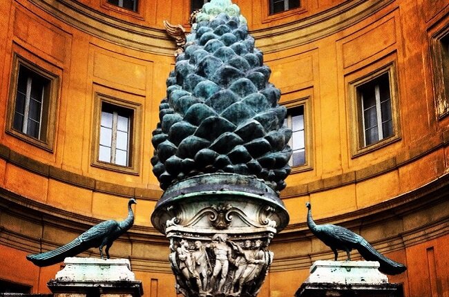 В музейном комплексе Ватикана есть специально спроектированный архитекторами дворик Giardino della Pigna, что в переводе значит Место сосновой Шишки. Странно то, что в главнейшем месте христианства не нашлось места, не Животворящему Кресту, не Деве Марии или Христу с апостолами. Центральное место всего архитектурного ансамбля занимает, Шишка – один из главных языческих символов. Шишка, являясь плодом хвойного дерева, еще с древнейших времен символизировало собой образ Вселенной, небо, Солнце, день, огонь, жизнь, плодородие, здоровье, внутреннее равновесие…. Древнейшие изображения этого загадочного символа найдены во всем мире. Например, эмблемой бога вина Диониса(Бахуса) являлся жезл с навершием из сосновой шишки, так же, как и венчающая колонну месопотамского бога Мардука. Сосновая шишка являлась очень распространенным символом и эмблемой многих богов и имела общий смысл для всех – символ тайны рудиментарного органа, «шишковидная железа» или «третий глаз», которым все из нас обла