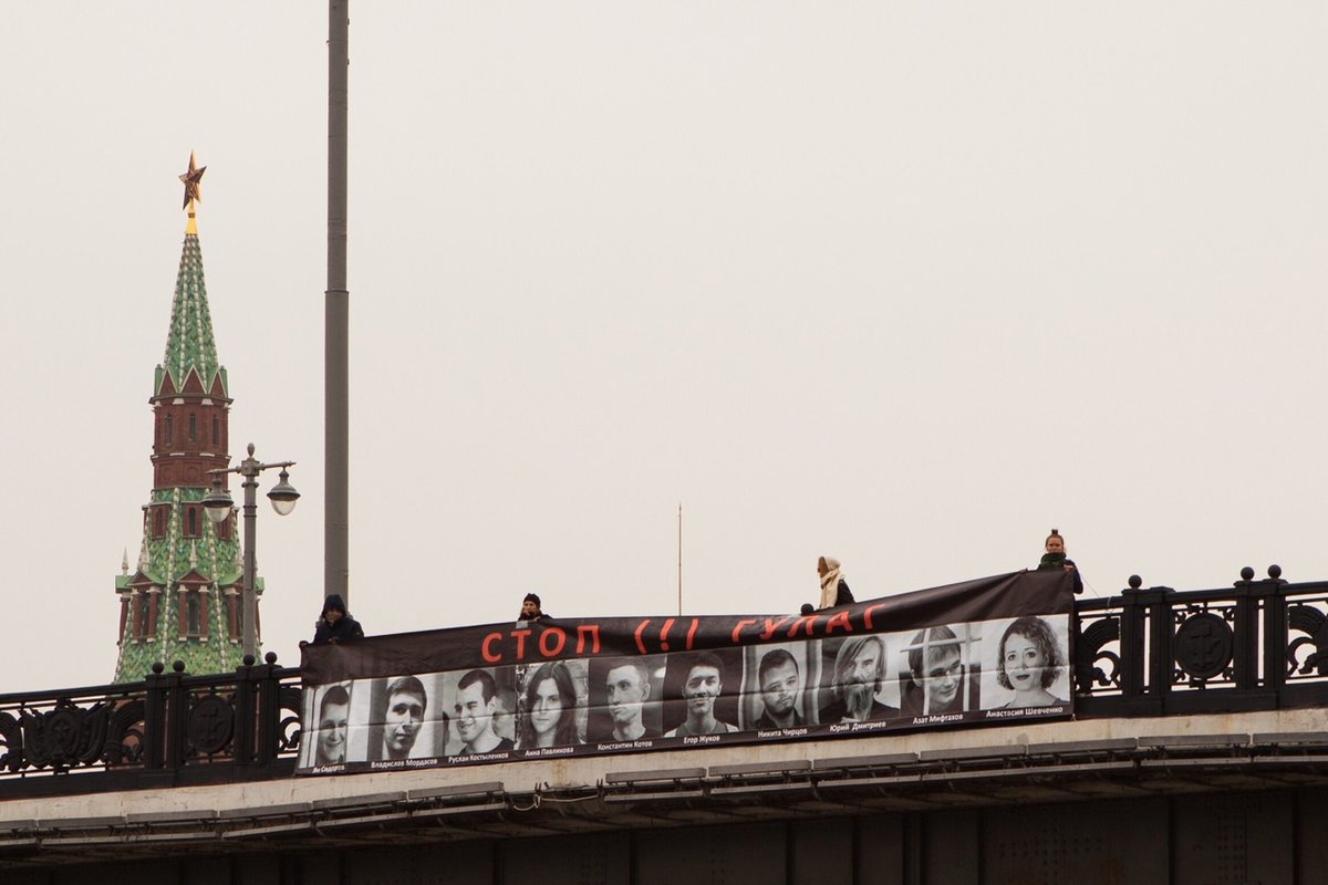 На нем можно увидеть фотографии фигурантов «московского дела» Егора Жукова и Константина Котова, главы карельского «Мемориала» Юрия Дмитриева, активистки «Открытой России» Анастасии Шевченко, аспиранта МГУ Азата Мифтахова, фигурантки дела «Нового величия» Анны Павликовой.