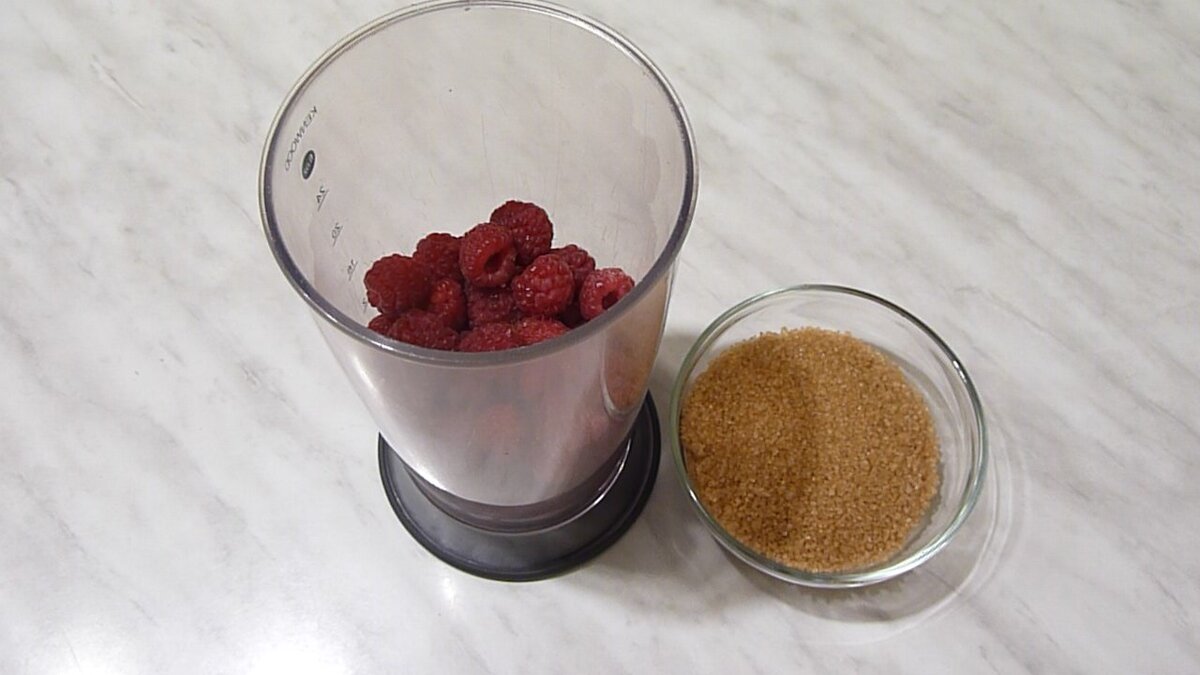 сахар — 100 гр В первом и самом простом соусе ягоды остаются свежими. Он не подвергается термической обработке. Для него мне понадобятся только ягоды и сахар. Я буду использовать малину. Я её уже засыпала в чашу блендера. Добавлю сахар. У меня пропорции 2:1, то есть на 2 части малины — 1 часть сахара. Но сахар вы можете регулировать по вкусу, а также ориентироваться по тому, насколько кислые ягоды. Для менее кислых ягод сахара можно взять поменьше. Либо в этом соусе заменить его мёдом, так как он не подвергаются