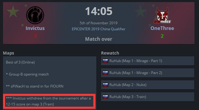 На проходивших 5 ноября китайских квалификациях к EPICENTER произошло редкое событие – игроки команды Invictus Gaming, в составе которой играют россияне V4D1M и Koshak, вышли из игры при счете 12-15 в пользу оппонента на третьей карте первого своего матча в группе.