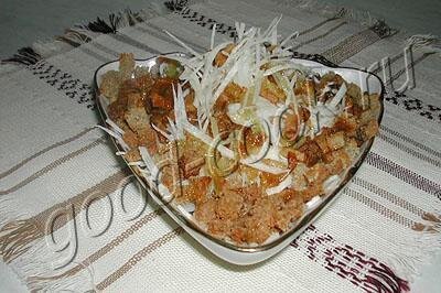 Сухарики нужно делать совсем маленькими, тогда салат будет более однородным по вкусу.