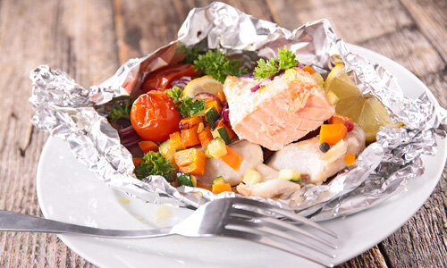 Многие хозяйки не задумываются о том, какой стороной использовать фольгу, матовой или блестящей. Вреда пищи ни одна, ни другая сторона не принесёт, но повлияет на вкус ваших блюд. При использовании маринада из агрессивных продуктов, таких как лимон, лучше выложить продукты на блестящую сторону, поскольку к ней они буду прилипать меньше, чем к матовой. Когда вы закрываете блюдо фольгой, то обязательно используете матовую сторону, поскольку она лучше притягивает тепло, следовательно блюдо будет сохранять тепло намного дольше. Важна также плотность фольги! Если она не плотная, то при запекании лучше обернуть мясо или рыбу в несколько слоев , при это не плотно прижимая их, так ваше блюдо получится более сочным и хорошо пропекётся! Если фольга достаточно плотная , то следует тщательно заворачивать продукт, чтобы сок не вытек. Тогда блюдо сохранит мягкость. При приготовлении рыбы хорошенько посолите и добавьте несколько лавровых листочков, затем заверните в несколько слоев фольги