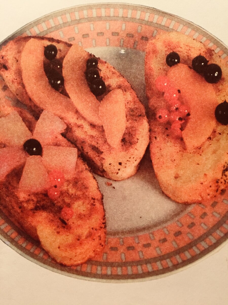 Ингредиенты: 4 ломтика батона 1 яйцо 2 консервированных персика 40 г сливочного масла 1 столовая ложка персикового сиропа 50 мл молока ягоды черной и красной смородины Способ приготовления: Яйцо взбить. Персики разрезать на небольшие ломтики. Ягоды смородины вымыть. Затем ломтики батона опустить ненадолго в молоко, затем сразу во взбитое яйцо, и выложить на сковороду с разогретым сливлчным маслом. Обжарить с двух сторон до румяной корочки и затем остудить. На каждый ломтик поджаренного хлеба выложить ломтики персиков и ягоды. В конце полить гренки сиропом. Приятного аппетита!