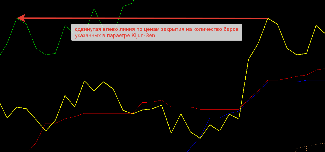 Не будем углубляться в историю, оставим это дело ... и попробуем разобраться, что это за индикатор. На каких принципах строятся его линии. Настроек у него не так много, всего три параметра. А вот рисуемых линий значительно больше чем у большинства стандартных индикаторов. К тому же названия у всех параметров достаточно странный "Tenkan-sen","Kijun-sen","Senkou Span B". После запуска на чарте появляется несколько линий. Разберем, что же означает каждая из них. Если использовать стандартные цветовые настройки индикатора Ишимоку, то на чарте отображаются зеленая(Cikou Span), красная(Tenkan-sen), синяя(Kijun-sen), песочно-коричневый(первая линия облака ишимоку), цвет "thistle"(вторая линия облака Ишимоку) линии. Зеленая линия индикатора Ишимоку или Chikou Span - это сдвинутая влево линия цены по ценам закрытия. Красная линия индикатора Ichimoku или Tenkan-sen - это середина между минимальным и максимальны