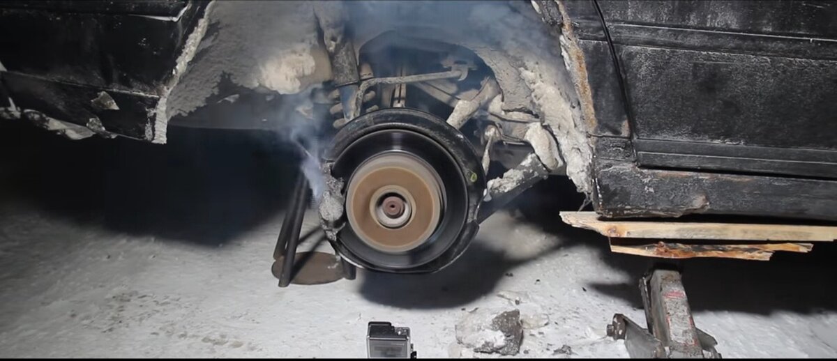 При одновременном нажатии на обе педали растёт крутящий момент двигателя. Готовьтесь, что после таких экспериментов больше всего пострадают диски, суппорта и колодки ручника. На механической коробке, при отпущенной педале сцепления и зажатых педалях тормоза и газа, между дисками сцепления возникает трение с выделением большого количества тепла, и в итоге диски выходят из строя. На авто с АКПП крутящий момент передаётся через гидротрансформатор, который потом первым делом сгорает. Из эксперимента видно, что от перегрева полетела тормозная система и сгорели манжеты, сам диск тоже зажарился и появилась окавина. Колодки... их выгнуло от давления в поршнях и сгорели все сальники. Короче говоря, не нажимайте на две педали во время движения, иначе будете оплакивать старый движок и отдадите кругленькую сумму за новый.