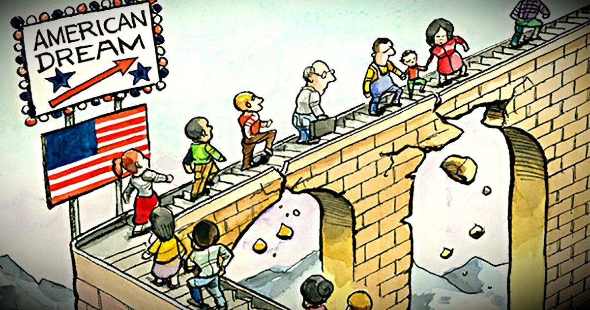 In god we trust – написано на долларе. А во что продолжают верить простые американцы? Американская мечта звучит так – работай честно и станешь богат. Может не ты, но дети. Ну уж внуки точно. Только вот что-то число миллионеров в США не растет так же быстро, как и количество проживающих в этой благодатной стране. Неужели все поголовно работают спустя рукава? И каждое следующие поколение вынуждено прикладывать все больше и больше усилий, чтобы достичь хотя бы уровня благосостояния своих родителей. Растет социальное неравенство и расслоение в обществе. Так на долю 20% богатых американце приходится более половины национального дохода. А вот разница между десятью процентами самых богатых и десятью процентами самых бедных американцев увеличивается с каждым годом. Постоянно снижается почасовая оплата. Правда, при этом заработная плата увеличивается в среднем, но работать приходится все больше и больше и деньги даются все труднее и труднее. А американская мечта тает в далекой дымке неясных п