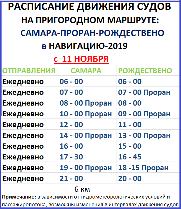 Уважаемые пассажиры! С 11 ноября 2019 г. вводится новое расписание пригородного флота по маршруту: Самара-Проран-Рождествено.
