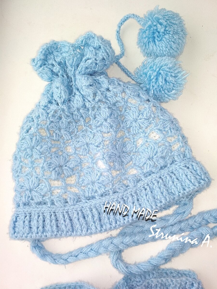 На вид это самая обычная шапка. Вязала я ее для дочери год назад. Как всегда хотелось в изделие привнести "изюминку". И я решила совместить обычную шапку и кружевную. Да! Это шапка двойная. Расскажу подробнее. Не помню точно нитки какого производителя использовала, но точно гипоаллергенные, без шерсти в составе. Сначала связала обычную шапку. Довязала не до конца, оставляя буквально 5-7 см для "резинки". По низу шапки нитками контрастного цвета сделала обвязку столбиками без накида, следующий ряд уже столбики с накидом (исходя из выбранного узора), и третий ряд уже начинаю вязать по выбранной заранее схеме. У меня это "цветы на сетке", вы можете выбрать любой, какой больше нравится. Узор, или верхнюю ажурную "шапку" вяжем длиннее чем наша основная шапка. Не закругляем. Когда высота ажура будет оптимальной, вязание заканчиваем. Вяжем шнур, продеваем в ажурную сетку на оптимальном расстоянии. Делаем и прикрепляем к концу шнура помпоны. Затягиваем и завязываем. По низу шапки делаем обвяз