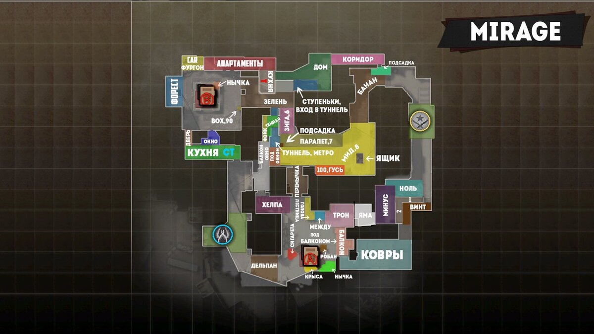 Действия на карте происходят предположительно в одной из стран Ближнего Востока, о чем нам говорит соответствующий антураж. Примечательно, что карта схожа с картой Dust 2 не только место действия, но и масштабами. Свое первое появление карта de mirage заслужила в легендарной версии cs 1.6. На тот момент она носила неофициальный статус, но чуть позже смогла закрепиться в ранге одной из самых часто играемых. Суть действий на данной карте сводится к защите или атаке (в зависимости от сторон) двух точек закладки бомбы. Примечательно, что карта mirage в cs go не претерпевала существенных изменений. В последнем крупном обновлении карты были убраны skybox, что позволяет теперь пробрасывать гранаты над картой. Грубо говоря, ранее на карте имелись невидимые стены, которые не позволяли кинуть гранату над большей частью карты. Теперь же такая возможность появилась, давая простор для фейковых раскидок. В том же обновлении изменили внешний вид ящиков, пофиксили ряд текстур и немного переработали