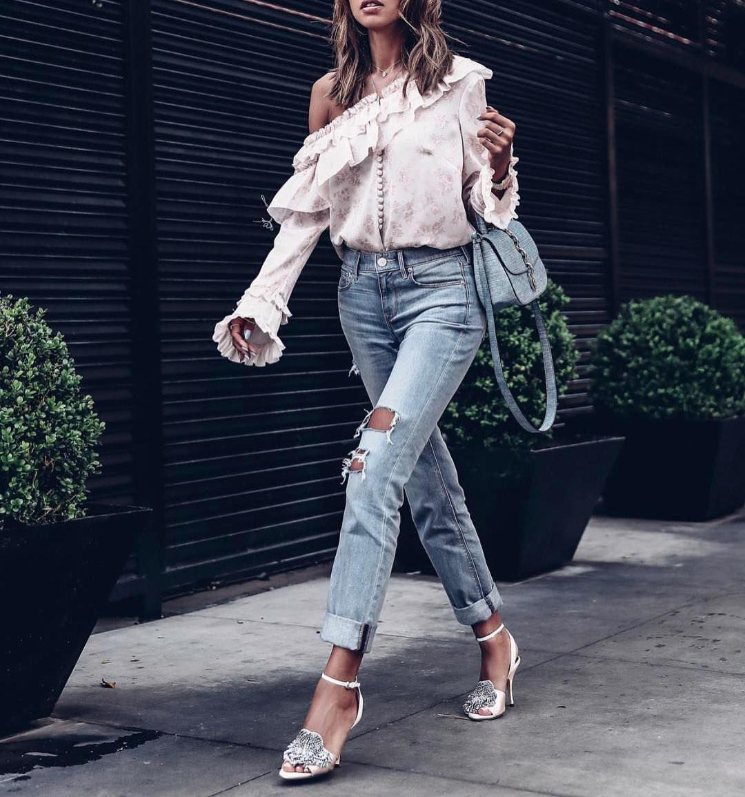 Блузка с оборками на одно плечо заправлена в рваные джинсы с манжетами, дополненные дерзкими босоножками на каблуке с щиколоткой. Идеальный наряд для повседневных уличных прогулок по городу, а также для баров и домашних вечеринок.