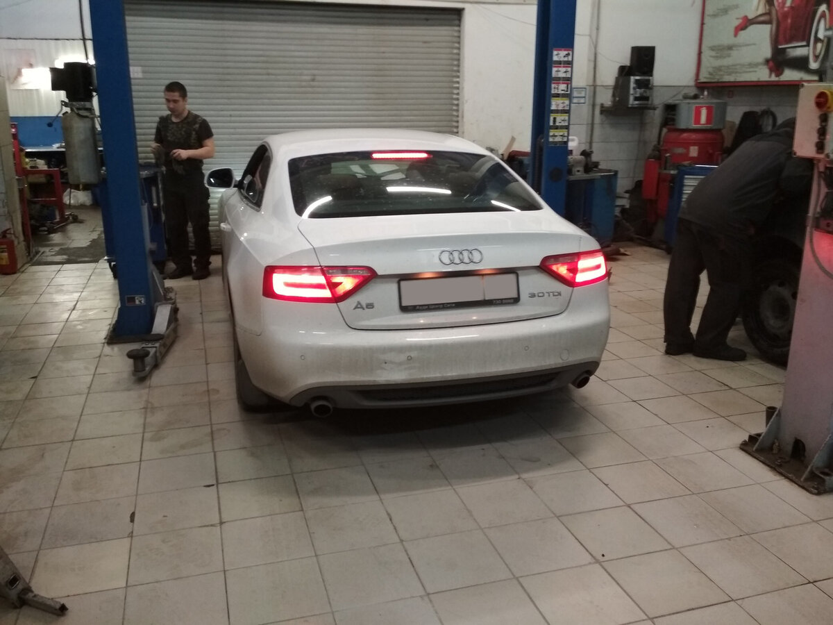 К моменту приезда к нам автомобиль пробежал 123 тыс. км и до этого в коробке масло не менялось, что несколько удивило нас: жидкость, которая слилась из коробки (у нас ZF6HP28), оказалась достаточно чистой. В поддоне, кроме фрикционной пыли (что вполне естественно), тоже не оказалось других загрязнений. Отсюда делаем вывод, что автомобиль эксплуатировался в бережных условиях, на трассе, например. И для сохранения АКПП в таком же состоянии меняем масло. Для начала снимаем защиту картера и подрамник. Сливаем масло, снимаем поддон АКПП и промываем его. Далее меняем фильтр, который расположен в поддоне и прокладку. Возвращаем все снятое на место и закачиваем масло насосом. Ближе к концу операции заводим автомобиль, поскольку уровень масла в трансмиссии выставляется при заведенном двигателе.
