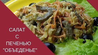 Рецепт: 1. Печень говяжья - 400 гр. 2. Морковь - 1 шт. (можно морковь по-корейски) - 150 гр. 3. Лук репчатый - 1-2 шт. 4. Яйца сырые - 3 шт. 5. Мука - 1 ст. ложка (без горки). 6. Огурцы маринованные - 2-3 шт. 7. Орехи грецкие - 35 гр. 8. Чеснок - 2 зубчика. 9. Майонез - 100 гр. 10. Соль - по вкусу. САЛАТ ОЧЕНЬ ВКУСНЫЙ И СЫТНЫЙ !!! ВСЕМ ПРИЯТНОГО АППЕТИТА !!! 1. Удалить с печени пленку и порезать на тонкие полоски. 2. На хорошо разогретой сковородке обжариваем