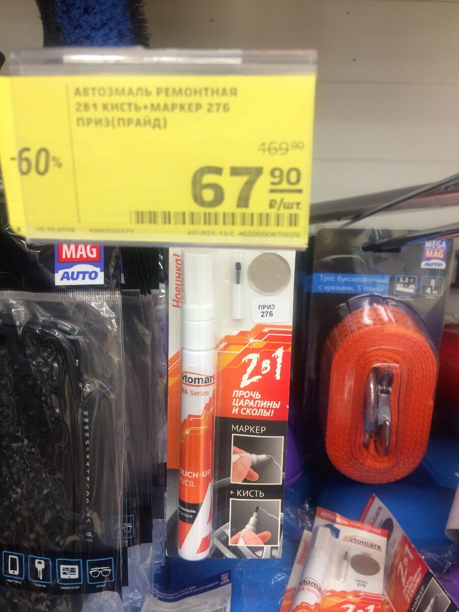 В магазине "магнит" можно встретить ряд товаров, в гипермаркетах, это не только продукты питания, но еще и богатый ассортимент товаров для бытового использования. Сегодня хочу обратить внимание на товары для автомобиля. Начать хочу с Автоэмали Два в одном кисть + маркер. Сейчас со скидкой - по цене в 67 рублей. Мелкие царапинки можно убрать таким путем. Сгон для воды: Маленький диаметр, отлично отчистит зеркала авто. Наклейка для авто В ассортименте. В автомобильных магазинах - подороже будет. Также можно заказать с "Алиэкспресс", но зачем ждать, если можно взять тут. Очиститель пластика с ароматом и антистатиком За 200 мл 62 рубля. Очень бюджетно. По качеству не проверял. Но имеет место быть. Чтобы #автомобиль был чистеньким. Очиститель двигателя и очиститель обивки салона Задумался об очистителе обивки салона, в связи с тем, что предстоит продажа старенькой "Нексии". Она у меня 2011 года. И нужно ее привести в идеальный порядок. Вот решил приобрести такое средство. До этого чистил са