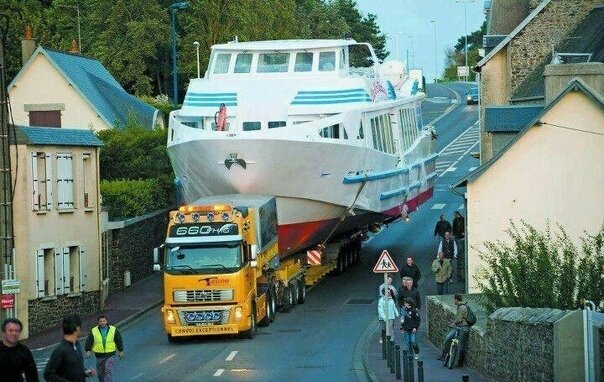 Сегодня я вновь предлагаю вернуться к вопросу перевозки негабаритных и тяжелых грузов. Такие перевозки осуществляются довольно часто, но каждый раз поражают воображение. Не забывайте посмотреть предыдущую часть >> Перевозкой яхт и других речных и морских судов занимаются специализированные транспортные компании. Они используют только лучшее оборудование, которое может выдержать столь сложную работу. В данном случае, в качестве тягача использован Volvo FH16 с 660-сильным дизелем, который перевозит огромный теплоход на 8-осном низкорамном трейлере. На следующей фотографии вы видите процесс перевозки кормовой секции британской атомной подводной лодки HMS Astute. Для этого был использован специальная передвижная платформа с двенадцатью колесными блоками, высота которых может регулироваться независимо с помощью гидравлики. Такое решение позволяет всегда сохранять горизонтальное положение груза, не зависимо от наклона дорожного полотна. А это уже Канада. Тягач Western Star осуществляет доста