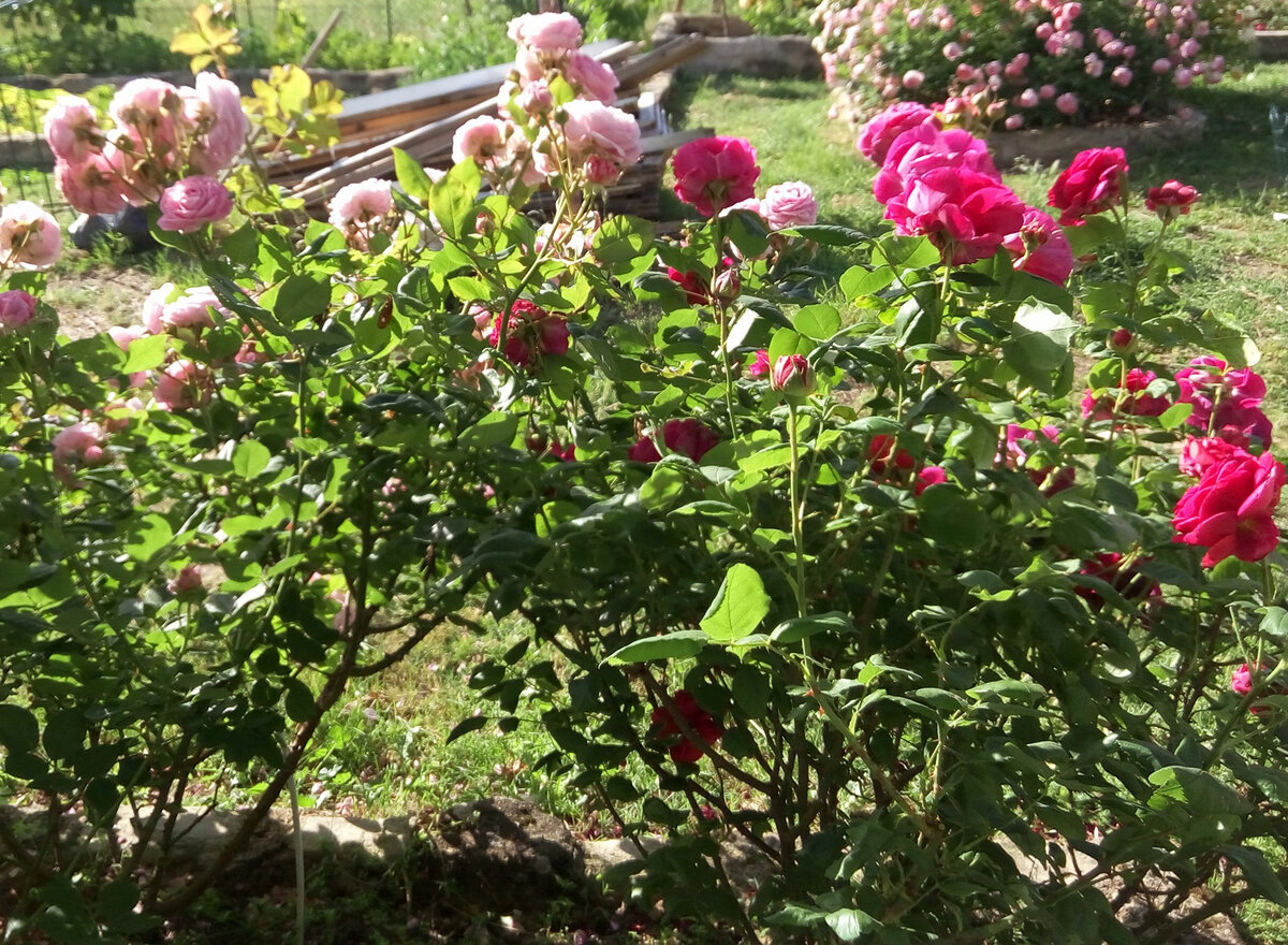 Прежде чем планировать цветник на очень солнечном участке, стоит ответить на вопрос: откуда вы будете брать воду для полива? Если своей скважины у вас нет, надо учесть, что без воды летом будет туго. Но если вода всё-таки есть, а поливать каждый день некогда, выручить может капельный полив - специальная система, которая присоединяется к крану с водой. В нашем случае это кран во дворе. Но можно также подсоединить его к большой бочке с водой. Вода должна быть тёплой. А бочка на некоторой высоте. Выбирайте растения не требующие обильного полива. Почти все многолетники надо располагать в полутени и хорошо поливать хотя бы раз в неделю в засушливые месяцы. Из цветов у нас самые неприхотливые: бархатцы, простые петунии, эшшольция. Не боятся жары эхинацея и портулак. Розы растут хорошо. При этом, в отличие от средней полосы, на юге возни с ними особой нет, растут, например, вместе с лавандой. Тюльпаны тоже неприхотливы. Мы высадили свои луковичные лет 7 назад. Они до сих пор вылезают и