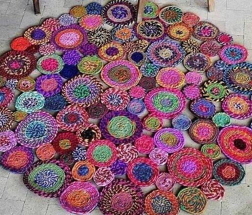 Разнообразные варианты ковриков, притягивающих взгляд своим оригинальным исполнением. 1. Коврик смастерили из ярких веревок и клея. Судя по фото - коврик тонкий и возможно не очень прочный. Если взять веревку потолще - тоже разных цветов - изделие будет прочнее. 2. Ковер из вязанных крючком цветочков - как яркие пятна на однотонном ковровом покрытии. Своеобразный акцент в интерьере дома. Коврик-сидушка. 3. Коврик из шариков, сделанных вручную и наполненных синтепоном и другими мягкими наполнителями. В таком коврике необходима подложка -это ткань или сетка. 4. Вязанные крючком изделия объединены в общий коврик. 5. Коврик из пластиковых пробок. Тут используется поддон и клей или шило с проволокой/веревкой. Для прихожей вполне интересный и практичный вариант. 6. И конечно коврик из помпонов - подложка+ множество пряжи. Мягкий и пушистый вариант украшения дома. 7. Из дерева - необычно, ярко и неожиданно. Покрашенные бруски дерева + металл, коврик может сделать и мужчина. Уличный - на