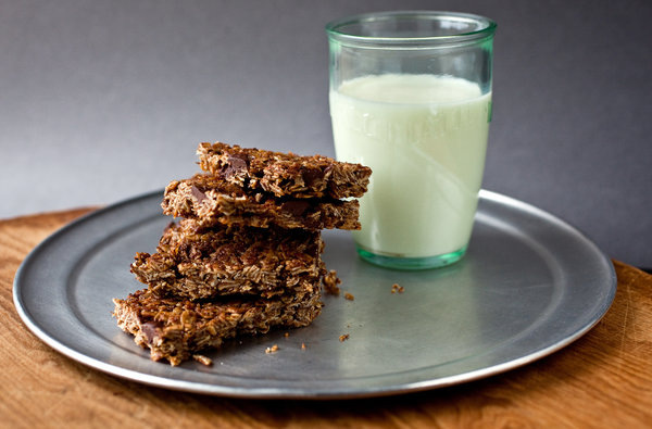 Большинство батончиков гранолы слишком сладкие на мой вкус, поэтому я не был большим поклонником, пока не попробовал "эти". Они вдохновлены рецептом Кима Бойса, но я сократил мед и добавил шоколад Выход: 15 - 20 штук Время приготовления: около 45 мин. Ингредиенты: Рецепт приготовления: Разогрейте духовку до 300 градусов. Обильно смажьте маслом толстостенную металлическую или стеклянную форму для выпечки. Растопите масло на среднем огне в широкой кастрюле. Добавьте хлопья или овес. Перемешайте на среднем огне, пока зерна слегка не поджарятся, стараясь не дать им сгореть. Перемешивайте до тех пор, когда они слегка потемнеют, шесть-семь минут. Снимите с огня и перенести в миску. Добавьте льняную муку, корицу и соль. Протрите кастрюлю начисто. Смешайте мед, ваниль и коричневый сахар на сковороде, в которой вы жарили овес. Доведите до кипения на среднем огне. Варите пять минут. Вылейте смесь овсяных хлопьев и перемешивайте, пока она равномерно не распределится по смеси. Дайте о