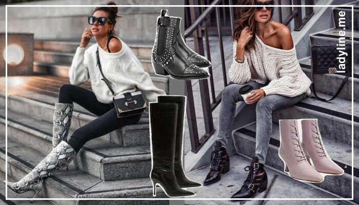 Наступающий 2020 год приготовил для нас много очаровательных новинок обуви разного материала и фасона. Цветовое решение ни оставит равнодушной ни одну модницу. С объемным верхом Верхняя одежда, оверсайз размера, на пике своей популярности, поэтому будет полезно понимать с какой обувью ее лучше всего сочетать. Грубые ботинки, остроносые полусапожки и ультрамодные казаки замечательно впишутся в общую картину с верхней oversize одеждой. С изящными юбками К утонченными и женственными юбками лучше покупать высокие сапоги трубы с анималистическим принтом или ботфорты. Обувь может быть выполнена как из натуральной замши, лака или кожи. Утонченный острый носок отлично гармонирует с изящными миди юбками. Со свитерами Объемные вязаные свитера здорово «подружатся» с трендовыми ботильонами на небольшом и устойчивом каблуке. Вашим лучшим приобретением станет пара белых сапог, которые также гармонично будут сочетаться с теплыми свитерами. Актуальными считаются классические черно-белые цвета или