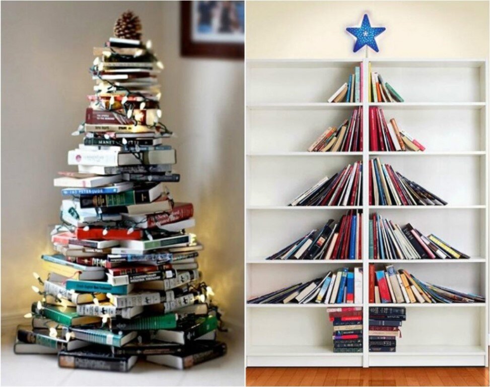 Всем доброго времени суток! Впереди долгожданные праздники, подарки, фейерверки, отдых культурный и не культурный, это у кого как. Но главным символом праздника была, есть и будет наша любимая елочка. От этой самой елочки праздник и становится волшебным. Не только такое чувство возникает у детей, но и у взрослых. Создать красавицу, можно своими руками, немного пофантазировать, помечтать и создать то, что будет вдохновлять всю семью, а может и даже коллектив на Вашей работе. Вообще вариантов изготовления елочек великое множество, можно создать из того чего много, или чем богата организация, или из того, что накопилось в Вашем рукодельном процессе. Все зависит от того какого размера планируете сделать лесную красавицу. Из книг. Для книголюбов отлично подойдет вот такая креативная елочка из книг. Хотите объемную, сложите книги как на фото слева и украсьте гирляндой. А если не хотите, чтобы занимала много места, отличный вариант с применением книжных полок. Сложите книги, ка