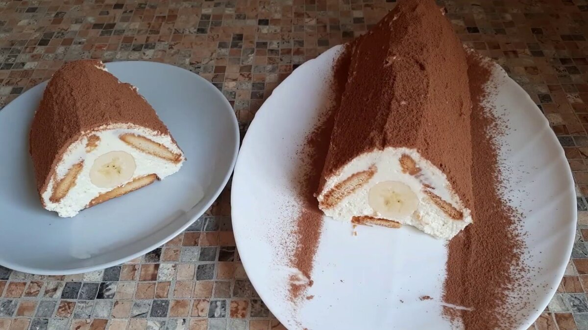 печенье-9 шт творог 9%-2 упаковки масло слив-130 гр сахар-4 ст л ваниль банан-1 шт какао-1 ч л или любое др. украшение