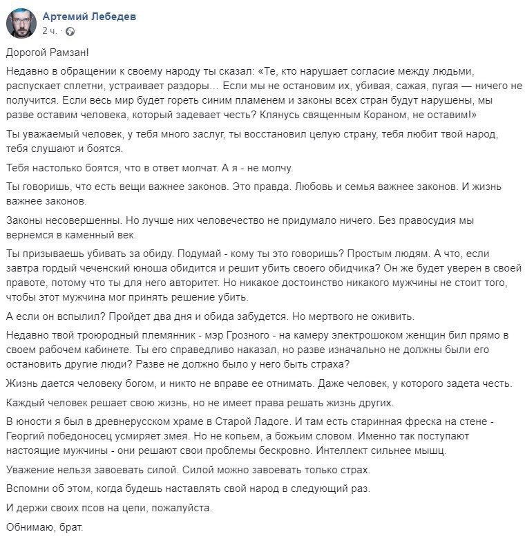 Рамзан Кадыров на прошлой неделе описал, как нужно разбираться с интернет-пользователями, видимо кому то не очень это понравилось! Главный отрывков из высказывания Лебедева : «Без правосудия мы вернемся в каменный век. Ты призываешь убивать за обиду. Подумай — кому ты это говоришь?» Спасибо за просмотр! Подписывайтесь на этот канал, чтобы не пропускать главные события дня! С вами был IFO.