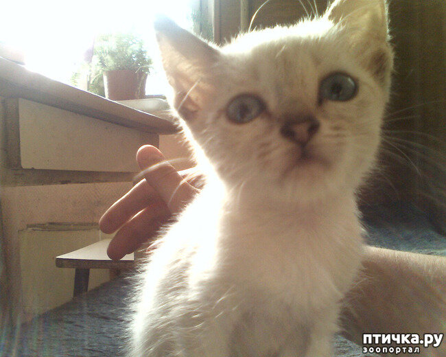 А вот белого, самого злого котенка, втроем впихнули в коробку, завязали скотчем и повезли на мопеде мне "дарить"... Причем при вручении своих травм Сережка не показал. Я коробку открыла, а там заморыш: тощий, грязный, блохастый, хвост морковкой, цвет как у тряпки, которой пыль вытирают, лапки кривые. Зато глаза синие-синие, как сапфир. Взяла я ее, а она молчит. Просто тугой комок на руках из нервов, ненависти и грязи. Тут Сергей мне свои разодранные до локтей руки показывает, говорит, где справедливость, он тут эту вредину спасал, а она... В общем, принесла я котейку домой, она все букой держалась. Помыла, покормила - оказалась, она практически белая, только уши, мордочка, кончик хвоста и лап затемненные. В коридоре стояли ящики, мы в них газеты складывали, вот она в глубь под них и забилась. Полезла я ее доставать, а кошка меня лапой как стукнет! Руку вынула, палец разодран, кровь струйкой течёт прям. Ух, зверюга, и не поверишь, что крохотный котенок, соплей перешибешь!