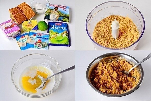 3. Высыпаете в миску крошки печенья и масло, хорошенько перемешиваете. После берете разъемную форму для торта, классический вариант — 22 см в диаметре. Дно формы застилаете пергаментной бумагой и выкладываете полученное тесто из крошек на дно формы, ровно распределяя и утрамбовывая. 4. Теперь отправляете тесто на полчаса в холодильник и приступаете к основной части торта — желейному крему. Заливаете желатин водой (100 мл) и оставляете гранулы набухать на 10 минут (или по рекомендации производителя, указанной на упаковке). После чего ставите на маленький огонь желатин и подогреваете максимум до 50 градусов — кипяти