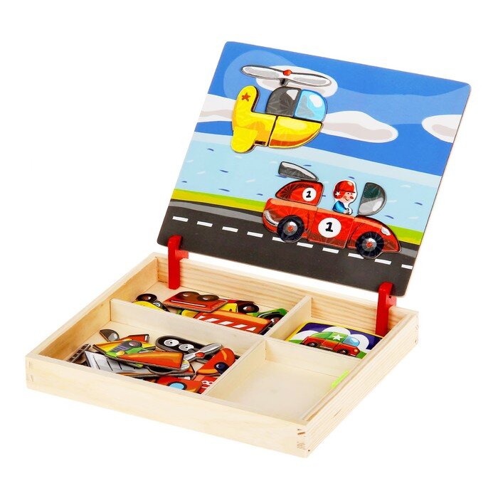 На магнитном поле есть дорога, море и небо - т.е. простор для всех видов транспорта! Как играть Что в комплекте В комплекте карточки, маркер, магнитные элементы.