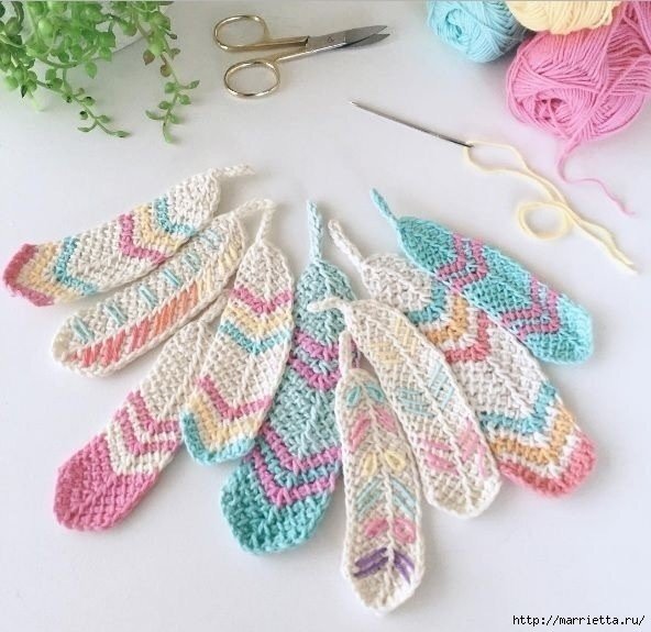 Посмотрите,какое прелестное перышко, вязаное крючком! Его можно использовать и отдельно( допустим,закладка в книги), и как элемент какого-либо декора. Смотрится оно стильно и оригинально, а вяжется очень легко. Вот схемы для различного размера перышек: Вот более подробно одна из схем: Можно связать,используя разного цвета нити. Можно сделать монотонными, а нужный узор потом вышить сверху. Вот какой очаровательный ловец снов, декорированный как раз такими перьями. Подобное сделать под силу и начинающим мастерицам. В общем,вдохновляемся, творим и вытворяем!:)