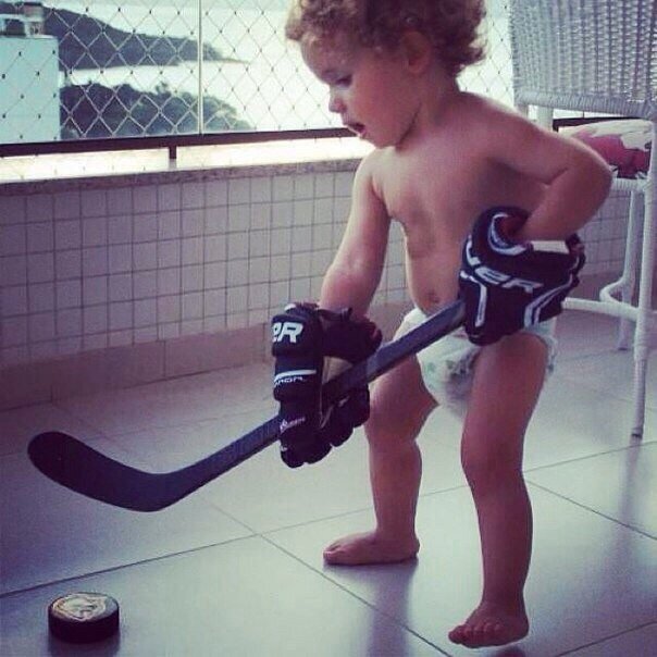 У совсем малыша, с детства любимой игрушкой была клюшка, маленькая такая, но уже как настоящая, даже перо с загибом. Ну а какая еще может быть любимая игрушка у ребенка, если кроме нее он почти ни чего и не видит, а еще шайба, но шайбой может быть все, что угодно. Так вот со своей любимой клюшкой он почти не расставался.