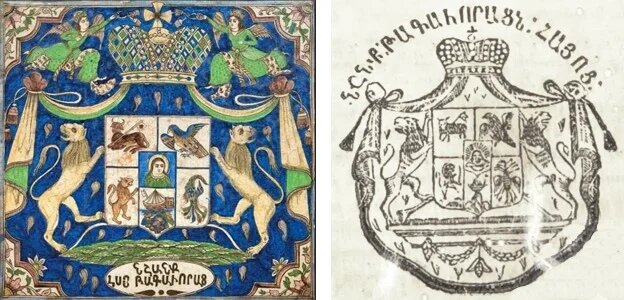Исторические гербы армянского царства. Слева - персидский рисунок середины XIX века, справа - рисунок опубликованный в конце XVIII века в первом армянском ежемесячном журнале "Аздарар", издаваемым армянской диаспорой в Мадрасе Странный герб