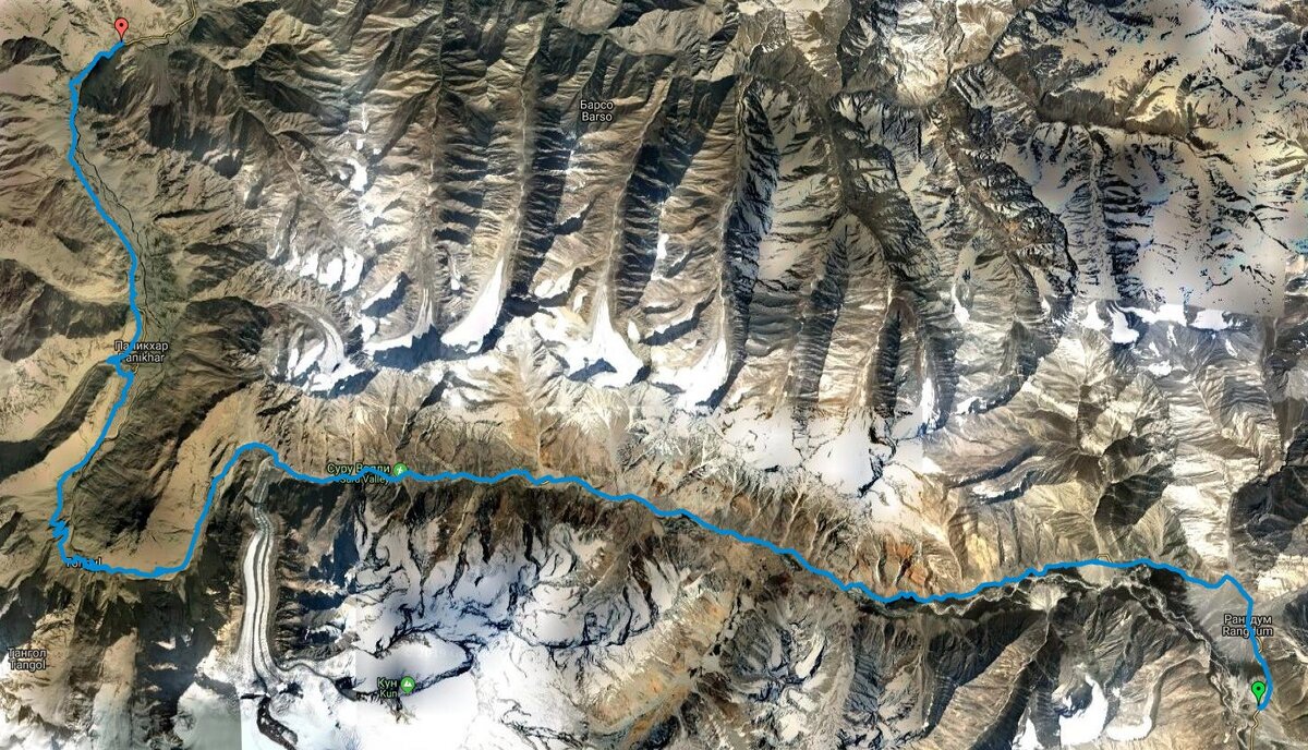 Высота ночевки: 3 155 м Утром подъехали поближе к монастырю, расположившемуся в центре долины и заметному издалека с любой стороны. Рядом с монастырем лагерь военных. Люди с оружием. Оказалось, что вместо монастыря – музей. Вчера вечером Саша читал отчет о вкусном ресторане в деревне Помикар. Все утро едем с целью там поесть хорошей местной кухни. Но нам не везет, заведение не работает. В итоге без обеда едем до 17 часов. Ледник с ледопадом – Паркачик. Красивый, величественный. Вершины рядом 7 000+ м: Кун (над ледником Пакарчик), потом Нун. В деревнях, которые проезжаем, следы схода селя, разрушения. Дорогу чинят (или новую строят) – взорвали динамит после нашего проезда. В д. Тангул – река скрыта в ущелье, так что ее не видно с моста. Красивая деревня: поля, старый город, дорожки через ивовые рощи. Выбираем дорогу в Паникар по левой стороне р. Суру. На правом берегу, похоже, новая дорога.