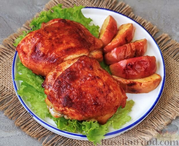 Как приготовить куриные бёдра в соусе из кетчупа, мёда и горчицы запечёные с яблоками.