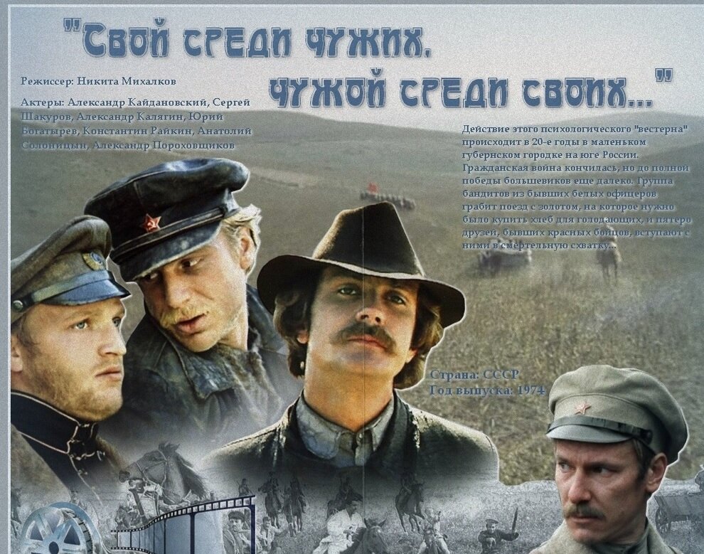 Доброго времени суток, уважаемые читатели. 11 ноября 1974 года на советские экраны вышел фильм режиссера Никиты Михалкова "Свой среди чужих, чужой среди своих". Фильм был снят по повести Эдуарда Володарского и Никиты Михалкова "Красное золото". Жанр фильма можно охарактеризовать как истерн (по аналогии с вестерном), то есть игровое приключенческое кино, действие которого обычно происходит на юге страны, на Кавказе или Сибири обычно в период Гражданской войны. Съемки проходили в павильоне в Москве, в Чечне и Азербайджане. В фильме очень много сложных каскадерских трюков, сложных комбинированных съемок, что делает его очень зрелищным. А музыка композитора Эдуарда Артемьева просто шедевральна. Кстати, Юрий Богатырев сам исполнил большинство трюков, один раз сильно ушибся упав с лошади. Фильм посмотрело 23,7 млн. зрителей. Фильм стал классикой советского кино. Вкраце, главного героя, чекиста Егора Шилова (Юрий Богатырев), подставляют при организации транспортировки конфискованного золот