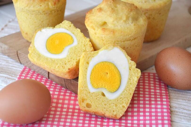 Вкусная и милая закуска, которую очень легко приготовить и не займет у вас много времени. Если вы ищете что то новое, чтобы подать на стол или же можно приберечь рецепт на Пасху). Попробуйте их и дайте мне знать ваше мнение. На 4 маффина: 1 яйцо 100 мл молока 30 гр растительного масла 125 гр муки 50 гр сыра пармезан 1 чайная ложка соли 1 чайная ложка мгновенных дрожжей 4 яйца для начинки Для начала отварите 4 яйца в кипящей воде в течение 10 минут. После приготовления очистите их. Теперь приготовим тесто для маффинов, для этого объедините в миске молоко, масло и яйцо. В другой миске смешайте тертый сыр, муку, дрожжи и соль. Соедините в две смеси в одной миске. Все тщательно перемешайте, выложите смесь в формочки, положите вареные яйца и накройте еще небольшим количеством теста. Выпекайте при температуре 180 градусов в течение 20 минут, затем дайте остыть. Ваши маффины с яйцом готовы, можете подавать к столу. Приятного аппетита). Пишите комментарии, подписывайтесь, чтобы не пропустить
