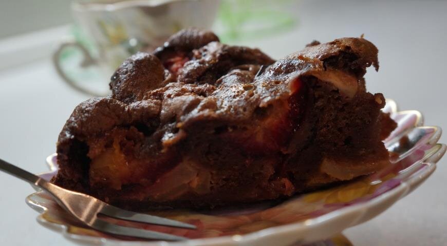 Ингредиенты: 3 яйца 200 г сахара ванильный сахар 1 чайная ложка разрыхлителя 200 г муки 2 столовые ложки какао 2-3 столовые ложки сметаны 2-3 яблока Для начала, разбиваем в глубокую посуду 3 яйца. Добавляем 200 грамм сахара и ванильный сахар по вкусу. Взбиваем миксером до однородной массы. Добавляем 2-3 столовые ложки сметаны (можно заменить на 30 грамм сливочного масла или 3 столовые ложки растительного масла). Добавляем 1 чайную ложку разрыхлителя. Далее добавляем 200 грамм муки, продолжаем взбивать. Добавляем 2 столовые ложки какао, взбиваем до однородной массы. Добавляем порезанные и очищенные от кожуры яблоки, перемешиваем. Выкладываем в форму для выпекания, сверху украшаем кусочками яблок. Ставим в духовку (180 градусов) на 45 минут. Вот и все, наша шоколадная шарлотка готова! Приятного аппетита!