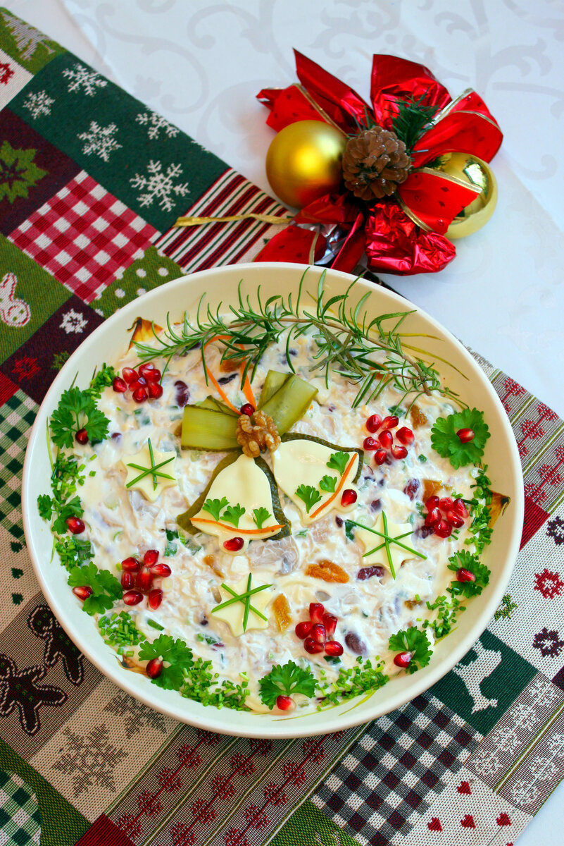 Без этого салата не проходит у меня ни один Новый год - он настолько полюбился в моей семье. Он очень вкусный из за сочетания продуктов - сладкой кураги и граната с солеными огурцами и морковью по корейски, нежным куриным мясом и грибами с свежей зеленью и огурцом. Здесь все в норме и дополняет вкусами друг друга. Готовьте без сомнений. Украсьте в новогоднем стиле и подавайте к столу.