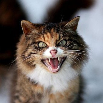 Для того, чтобы показать свое недовольство, котики могут дыбить шерсть, прижиматься к земле и шипеть, угрожающе и сурово. Они с удовольствием показывают свои клычки и прижимают уши, чтобы противник сразу видел - оппонент готов к битве не на жизнь, а на смерть!