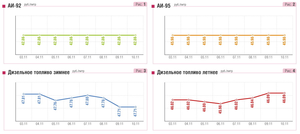По отношению к 10 ноября 2018 года средняя цена на бензин 92 повысилась на +2,78% (+1,16 руб./литр), на АИ-95 — на +3,09% (+1,38 руб./литр), на дизельное топливо зимнее — на +5,30% (+2,40 руб./литр), на дизельное топливо летнее — на +4,56% (+2,01 руб./литр).