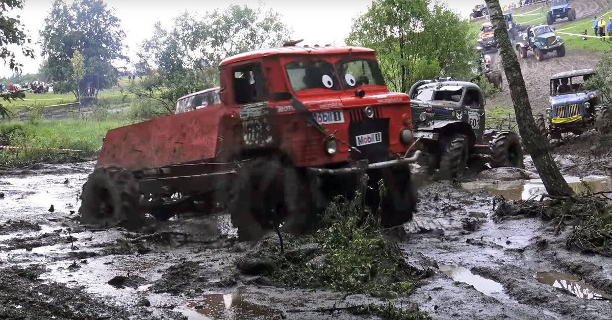В Эстонии уже несколько лет проходит одно из крутейших внедорожных соревнований, которое называется Klaperjaht. На старт очень сложной трассы, изобилующей глубокими лужами и затяжными подъемами из скользкой глины, выходят серьезно подготовленные внедорожники. Но самое интересное то, что там очень любят советские грузовики, которые превращают в модифицированные внедорожные монстры. Я хочу показать вам машины некоторых участников. А начну вот с этого оранжевого ГАЗ-66 с бортовым номером "666". Я решил начать с него, потому что он выглядит самым обычным по сравнению с вездеходами других участников. У него стандартная колесная база но немного модифицированные мосты. Вместо кузова установлена металлическая конструкция с двумя плоскими листами. Скорее всего они выполняют лишь декоративную функцию. На этой же фотографии вы видите еще один очень любопытный вездеход, о котором мы поговорим далее. Он создан на базе укороченного шасси советского грузовика ЗИЛ-157. От трех осей осталось лишь две,
