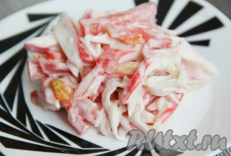- Все хорошенько перемешать и отправить салат с крабовыми палочками и помидорами в холодильник до полного охлаждения.