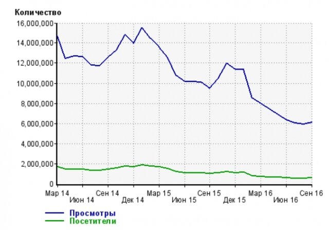 И действительно… с момента локального пика "просмотров страниц" в объеме 11,4 млн. при 1,1 млн. посетителей, показатель августа-16 составляет 5,9 млн. просмотров на 0,53 млн посетителей. Статистическое "падение" - вполовину!