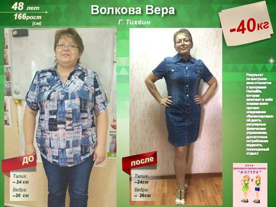 Сегодня делимся крутым результатом нашей клиентки Веры : Меня зовут Волкова Вера. Мне 48 лет. До встречи с Клубом мой вес достиг почти 115 кг. С лишним весом было нелегко, начались проблемы со здоровьем, мучала отёчность, тяжесть в ногах, хроническая усталость, сбивалось дыхание уже на втором этаже, перестало нравиться своё отражение в зеркале, было тяжело подобрать одежду и обувь в магазинах. Летом 2015 г. я увидела результат моей подруги , которая уже похудела на 20 кг; я заинтересовалась, она меня отвела в клуб, познакомила с консультантом , и мы все вместе приступили к борьбе с моими проблемами - поменяли завтрак, нормализовали водный режим, другие привычки питания, и за первый месяц я комфортно убрала 6,5 кг. У меня добавилось энергии, улучшилось настроение, прошла отёчность, стала чаще заглядывать в зеркало. В магазин за обновками хожу с удовольствием! У меня наконец то не одна разношенная пара обуви на все случаи жизни… Думаю многие меня поймут. На сегодняшний день, спустя ровн