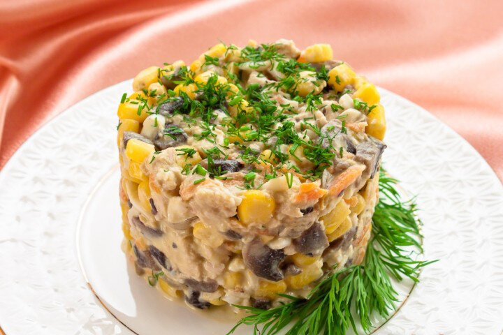 - Смешайте грибы, курицу, лук с морковкой и кукурузу. Заправьте майонезом.