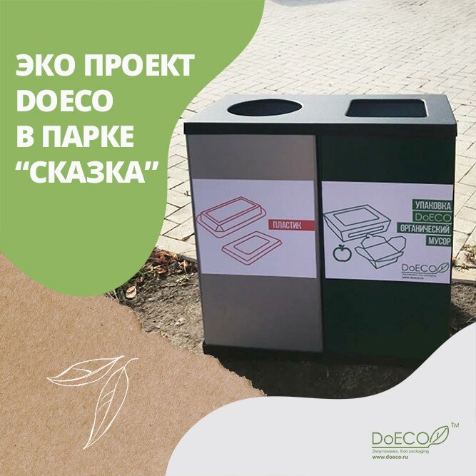 В середине сентября мы запустили свой собственный экопроект. Для улучшения экологической обстановки руководством компании было принято решение организовать раздельный сбор мусора в местах массовых продаж продукции бренда DoECO. Начало было положено на западе Москвы на территории многофункционального семейного парка развлечений «Сказка». Сейчас там располагаются двойные брендированные контейнеры для раздельного сбора мусора, в одну часть которых можно выкинуть использованную упаковку DoECO с остатками еды (что является органическими отходами), а в другую часть - пластик. Также мы организовали вывоз раздельно собранного мусора в пункт по сортировке мусорных отходов. Далее после тщательной сортировки мусор утилизируется в соответствии с правилами и нормами Федеральных законов № 89 и № 503 РФ. Дмитрий Савельев, Генеральный директор компании GDC, об экопроекте: «Почему мы задумались о подобной инициативе? Дело в том, что продукция именно нашей компании наиболее широко представлена на рынк