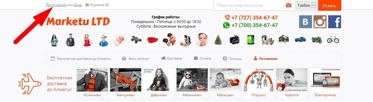 Покупка товаров с сайта marketushop. Как зарегистрироваться на marketushop. Есть два варианта регистрации на интернет-сервисе marketu.kz: Регистрация при помощи электронной почты (рекомендуемый вариант) Для того что бы зарегистрироваться на интернет-сервисе marketu.kz, Вам необходимо перейти на страницу регистрации http://marketu.kz/registration Далее Вам необходимо заполнить регистрационные данные: Далее необходимо поставить галочку на пункте "Я не робот" и выполнить задание системы защиты. После нажать кнопку "Зарегистрироваться" Регистрация при помощи социальных сетей Также, можно выполнить регистрацию через социальные сети: нажав на удобную для Вас иконку социальной сети, система попросит пройти авторизацию в социальной сети. После этого регистрация через социальную сеть будет выполнена. (При регистрации через социальные сети авторизация на интернет-сервисе marketu.kz будет доступна только посредством социальных сетей)
