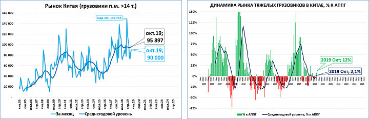 Грузовики - инвестиционный товар. Поэтому рынок грузовиков - хороший индикатор экономической активности. По итогам октября в Китае было продано 90 тыс. тяжёлых грузовиков. Это на 12% больше, чем в октябре прошлого года. Важно: годовые продажи (12 последних месяцев – «скользящий год») впервые показали рост (+2,1%) после девяти месяцев падения (исключение – март 2019). Другими словами возобновился рост в годовом выражении. Всего за последние 12 месяцев продано 1,15 млн. тяжёлых грузовиков Если темпы с начала года (+0,3% за 10 месяцев) сохранятся до конца года, то по итогам 2019 года будет превзойдён результат 2018 года и будет достигнут новый исторический рекорд. П.С. Для тех, кто использует Телеграм: Материалы этого блога можно на несколько часов (а иногда - дней) раньше прочитать на телеграм-канале "M2". В Телеграме его можно найти, введя в строку поиска @m2econ. Или воспользуйтесь ссылкой https://t.me/m2econ Подписывайтесь!