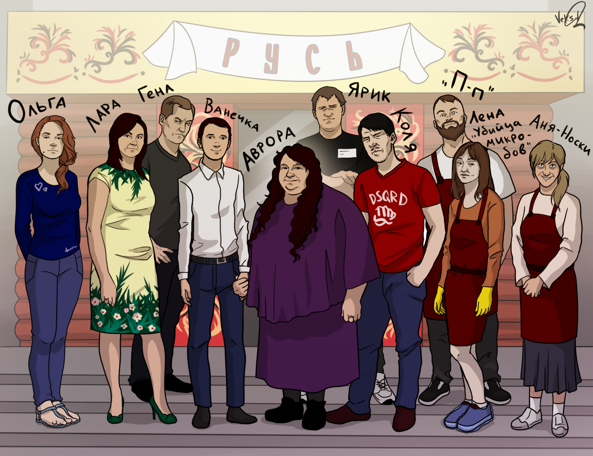 Внутри Гена увидел небольшой зал, где было 10 столиков и кухня. Ради приезда родственников, все столы были сдвинуты в один большой. Хозяйка кафе посадила зятя и сесту вместе, а сама села по центру стола. По обе стороны от неё сели Ванечка и узбек Коля. И тут Аврора решила познакомить с Гену и Лару со своими работниками. Засунув два пальца в рот и свистнув так, что у супругов заложило уши, Авора вызвала свой персонал, который тут же выстроился в ряд. Первым стоял повар П-П, способный произносить лишь глухой звук «П-п», но выполняющий беспрекословно любые приказы Авроры и Ванечки. Рядом с ним стояла официантка Аня-Носки, тема разговоров которой касалась только носков и ничего более. За ней стояла Лена «убийца микробов». Обычно она активно тёрла пол под ногами у ПП, приговаривая «я - киллер и убийца микробов, я истреблю всех!». Последним представили Ярика, который, с точки зрения Гены, оказался умнее остальных. Однако, Ярика нужно было периодически останавливать от льющегося словесного потока, желательно, ударом по голове.