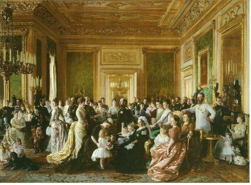 133 года назад состоялся официальный визит в Великобританию Великого князя Сергея Александровича и Великой княгини Елизаветы Федоровны. Они представляли Российский Императорский Дом на "золотом юбилеи" (50-летии) правления королевы Виктории. Сергею Александровичу очень понравился Виндзорский замок, где собрались королевские родственники. И вместе с супругой он был изображен среди большой семьи Виктории на групповом портрете, созданном художником Л. Туксеном. Картина и сейчас находится в собственности Королевской Фамилии. Во время знаменитого пожара 1992 года Зелёная гостиная, где создавалась картина пострадала не сильно, уцелел и знаменитый ковер на ее полу, сделанный по заказу Виктории и демонстрировавшийся на Всемирной выставке 1851 года. Интересно, что семья сегодняшней королевы Елисаветы также любит запечатлевать себя в этой комнате.